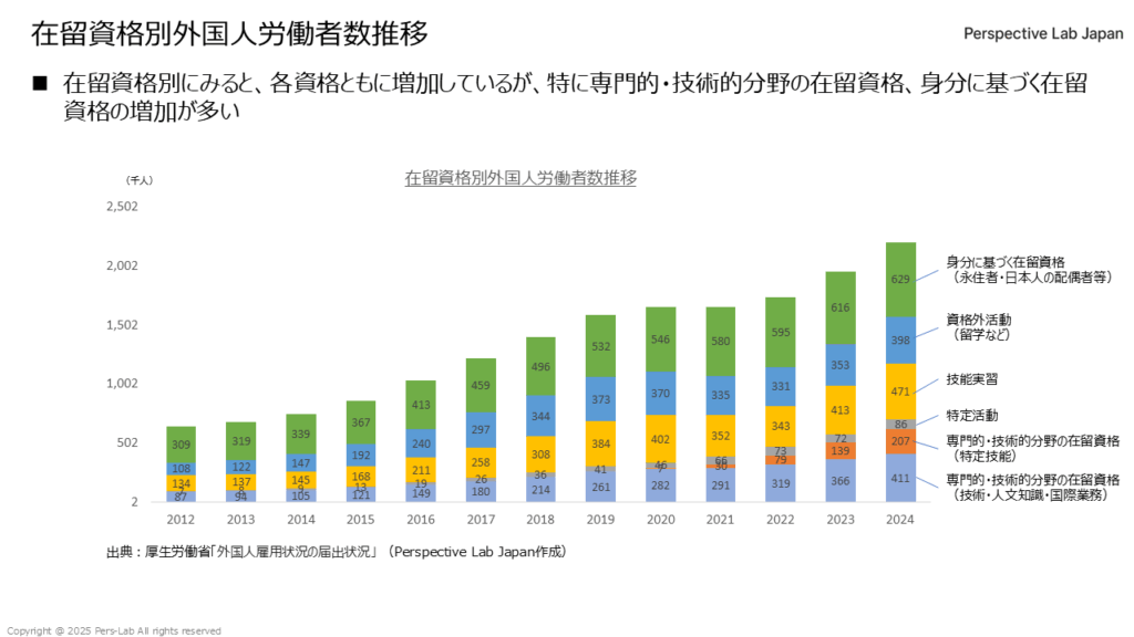 グラフでも、「特定技能」や「特定活動」などの項目が急増しており、制度の浸透と需要の高まりが反映されていることがわかります。