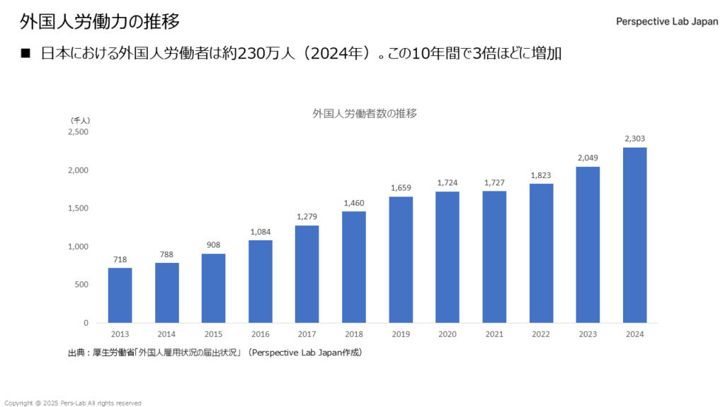 日本の外国人労働者数は、2012年の約68万人から、2024年にはおよそ230万人へと増加し、この12年間で実に約3.4倍にまで増加しました。